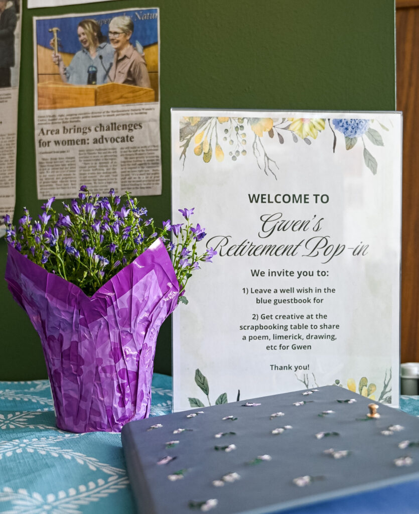 On Thursday, March 26th, the Women’s Centre hosted a drop-in event at the NOWC offices to celebrate Gwen’s retirement. Staff, friends and community members came out to share their memories and well-wishes for Gwen to celebrate this auspicious occasion of her 35 year career as Executive Director at the NOWC.