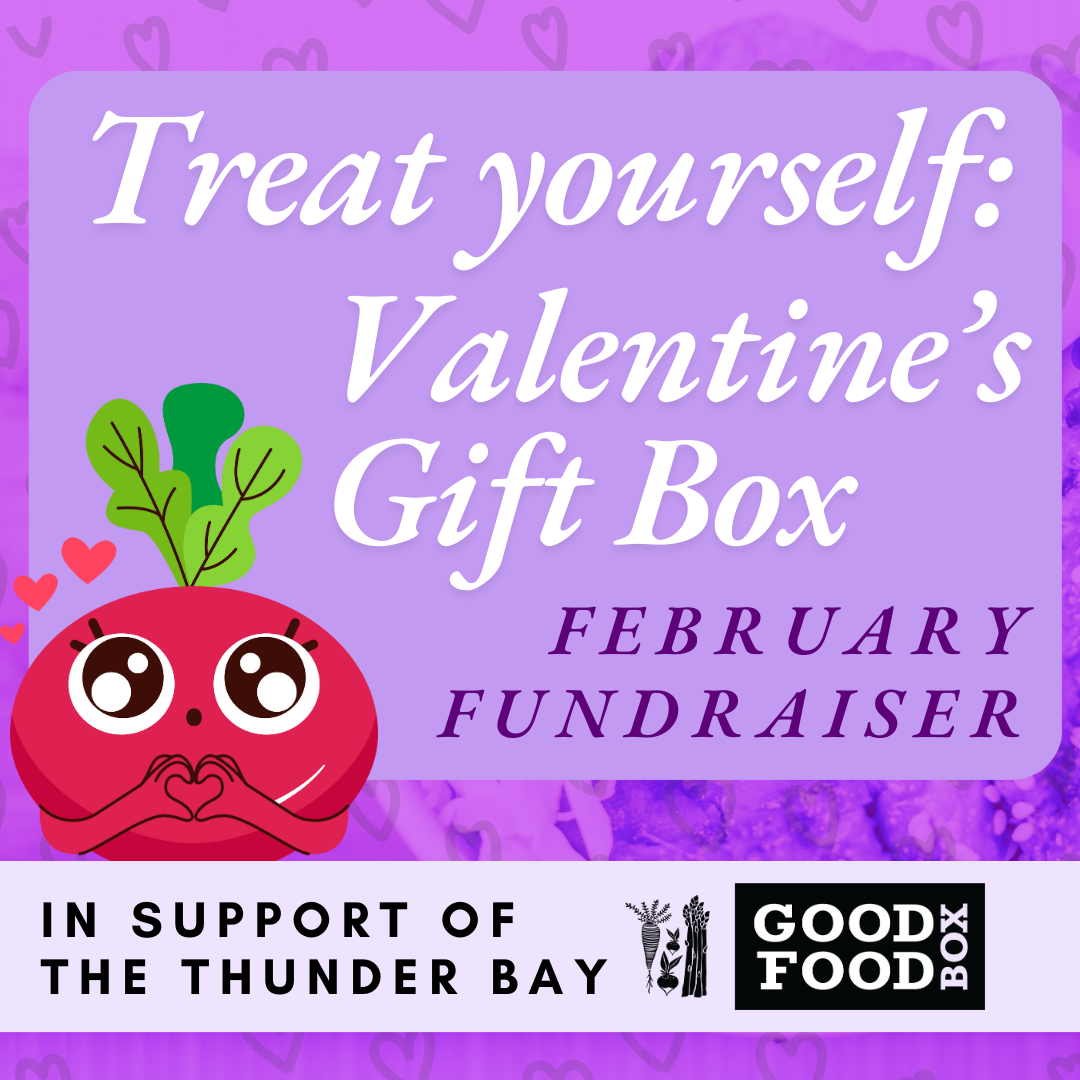 To celebrate the month of LOVE, consider purchasing a Fundraising Box in support of the Thunder Bay Good Food Box program! This fundraising box features a combination of locally-sourced tasty treats and handmade goods, made by our favourite local makers, producers, and artists! Support community food security while sharing the local love all at the same time! Treat yourself, gift it to your valentine, or share it with your friends!