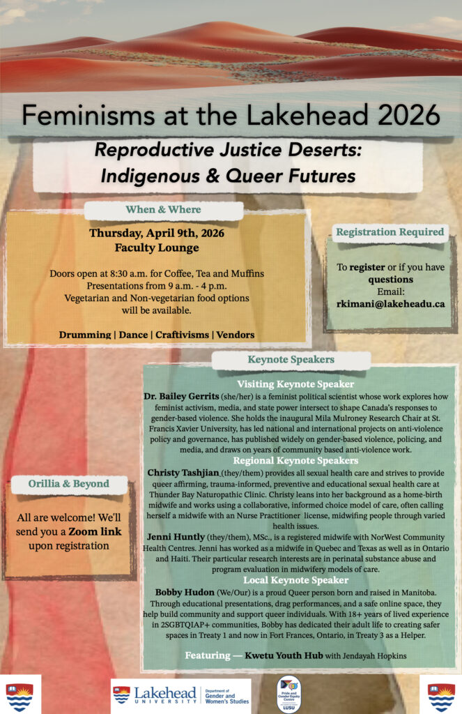 The Department of Gender and Women’s Studies, in collaboration with Lakehead University’s Gender Equity Centre and the SSH Dean’s Office, present the annual “Feminisms at the Lakehead 2026: Reproductive Justice Deserts – Indigenous & Queer Futures” event.