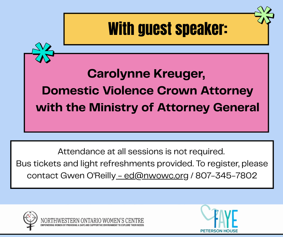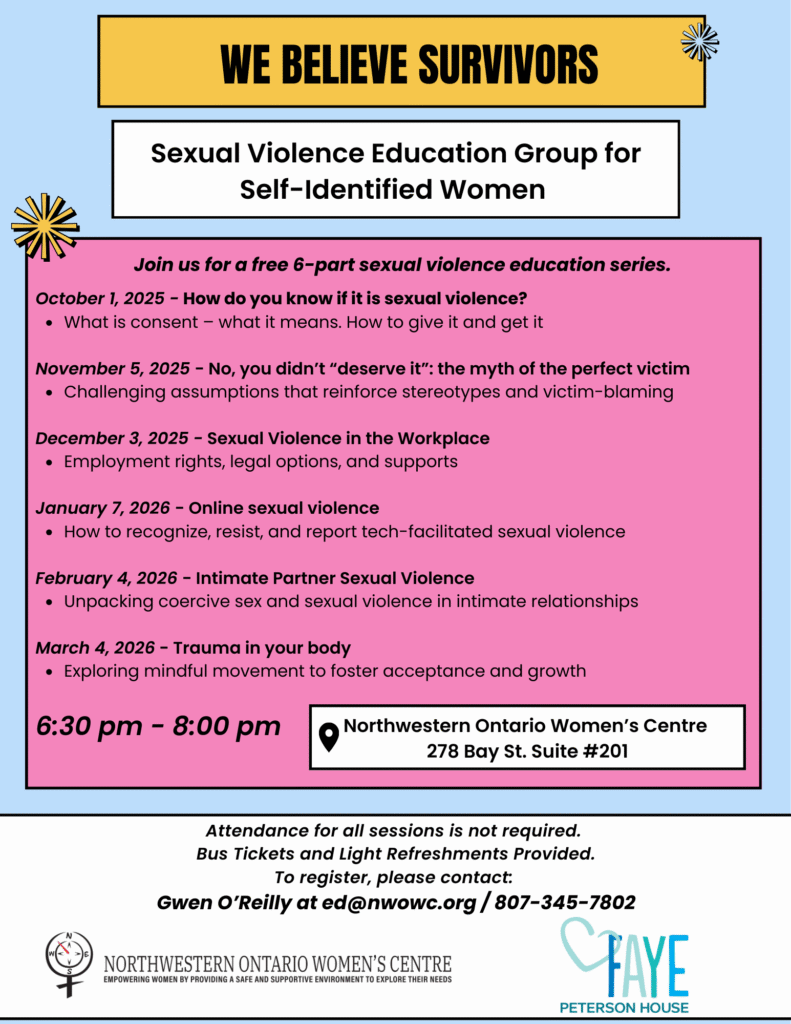 We are partnering with Faye Peterson House to offer a 6-part sexual violence education series. Sessions are open to self-identified women and girls (ages 18+) and will take place once a month from 6:30-8 pm at the Northwestern Ontario Women’s Centre (278 Bay St, Suite #201).