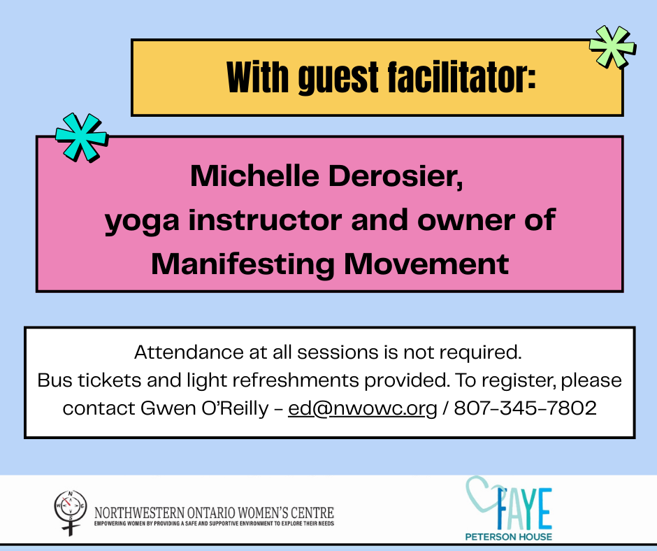 We are partnering with Faye Peterson House to offer a 6-part sexual violence education series. Sessions are open to self-identified women and girls (ages 18+) and will take place once a month from 6:30-8 pm at the Northwestern Ontario Women’s Centre (278 Bay St, Suite #201).