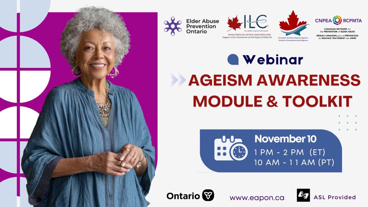Join the Elder Abuse Prevention Ontario, the Canadian Network for the Prevention of Elder Abuse (CNPEA) and the Canadian Coalition Against Ageism (CCAA) on Monday, November 10th from 1-2pm EST for a webinar introducing two new educational resources developed by the Canadian Coalition Against Ageism (CCAA) with stewardship and support from the International Longevity Centre Canada (ILCC) and older persons actively guiding and informing every step of the process. Webinar will be provided with ASL interpretation. Register today!